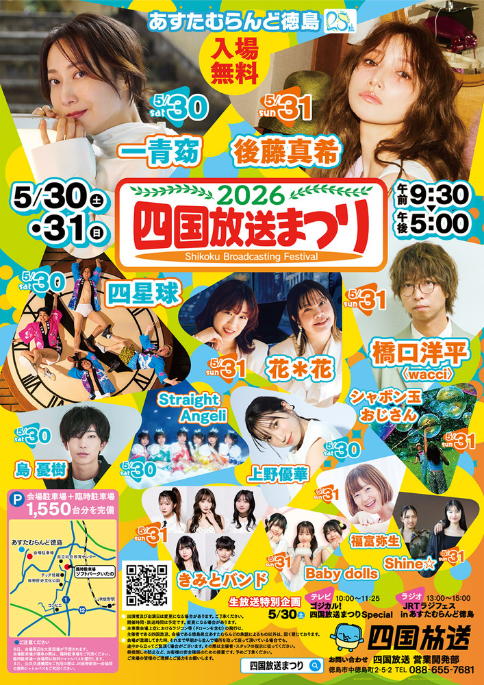 2026四国放送まつり Live / Media 2026/05/31(日) 徳島県 あすたむらんど徳島 地図を表示 【開場 / 閉園】9:30 / 17:00 【料金】入場無料 【出演】花*花/ 後藤真希/橋口洋平〈wacci〉 /シャボン玉おじさん / 他 [企画・運営・お問合せ] 四国放送(株)営業開発部 / TEL:088-655-7681(平日10時~18時) URLをコピーする 報告する